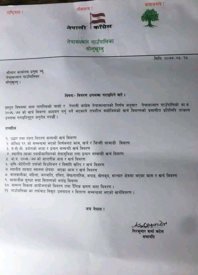 सभापति शर्मा कटेलले गाउँपालिकालाइ लेखेको पत्रमा कोभिड-१९ को नाममा भएको शिर्षकगत खर्च, उद्दार तथा राहतका नाममा भएको खर्च, जेसीभी प्रयोगको भाडा र खर्च विवरण, स्थानीय तहबाट स्वास्थ्य क्षेत्रमा भएका काम र खर्च लगायत ११ शीर्षकमा भएको खर्च बिवरणको माग गरिएको छ।