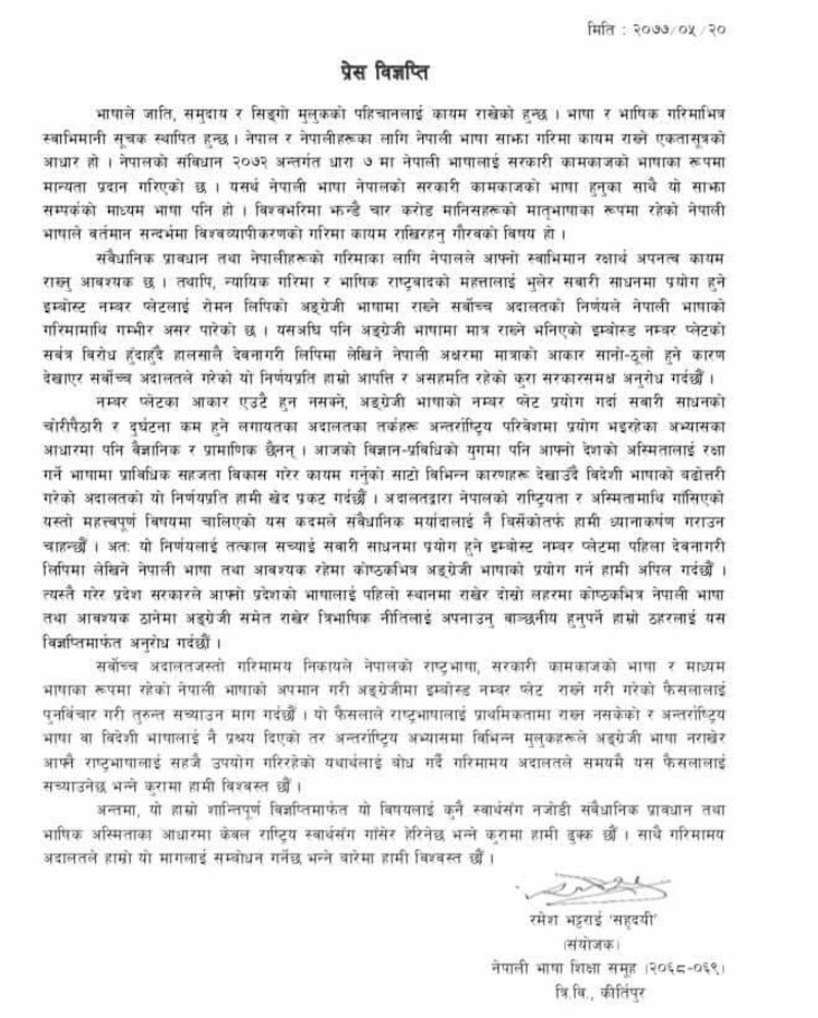 यसअघि पनि अङ्ग्रेजी भाषामा मात्र राख्ने भनिएको इम्बोस्ड नम्बर प्लेटको सर्वत्र विरोध हुँदाहुँदै हालसालै देवनागरी लिपिमा लेखिने नेपाली अक्षरमा मात्राको आकार सानो–ठूलो हुने कारण देखाएर सर्वोच्च अदालतले गरेको यो निर्णय त्रुटीपुर्ण रहेको भन्दै सो बिज्ञप्तिमा भनिएको छ,-‘नम्बर प्लेटका आकार एउटै हुन नसक्ने, अङ्ग्रेजी भाषाको नम्बर प्लेट प्रयोग गर्दा सवारी साधनको चोरीपैठारी र दुर्घटना कम हुने लगायतका अदालतका तर्कहरू अन्तर्राष्ट्रिय परिवेशमा प्रयोग भइरहेका अभ्यासका आधारमा पनि वैज्ञानिक र प्रामाणिक छैनन् । आजको विज्ञान–प्रविधिको युगमा पनि आफ्नो देशको अस्मितालाई रक्षा गर्ने भाषामा प्राविधिक सहजता विकास गरेर कायम गर्नुको साटो विभिन्न कारणहरू देखाउँदै विदेशी भाषाको बढोत्तरी गरेको अदालतको यो निर्णयप्रति हामी खेद प्रकट गर्दछौँ । अदालतद्वारा नेपालको राष्ट्रियता र अस्मितामाथि गाँसिएको यस्तो महत्वपूर्ण विषयमा चालिएको यस कदमले संवैधानिक मर्यादालाई नै बिर्सेकोतर्फ हामी ध्यानाकर्षण गराउन चाहन्छौँ ।’