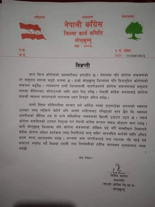 पछिल्लो समय सोलुखुम्बु जिल्लामा पनि कोरोना संक्रमण बढ्दै गएको उल्लेख गर्दै सभापति बस्नेतले स्थितिलाई काबुभन्दा बाहिर जान नदिन कोरोना लक्षित कार्यक्रम ल्याएर समयमै नियन्त्रण का लागि सम्बन्धित निकायको ध्यानाकर्षण समेत गराएका छन। कोरोनालाइ समुदायस्तरमा फैलन नदिन जिल्लाबासी नागरिकहरुलाइ सचेत हुन आग्रह गर्दै जारी बिज्ञप्तिमा कोरोना सम्बन्धी स्वास्थ्य मापदण्डको पूर्ण पालना गर्न जिल्लाबासीहरुलाइ अपिल पनि गरिएको छ।कांग्रेसले यथास्थानमा नै रहेर चाडपर्व मनाउन पनि जिल्लाबासीहरुलाइ आग्रह गरेको छ।