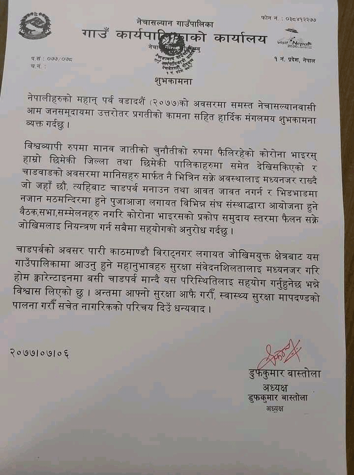 बिश्वब्यापी महामारीको रूपमा फैलिएको कोरोना भाइरस संक्रमण छिमेकी जिल्ला र गाउँपालिकामा समेत देखिइसकेको स्पस्ट पार्दै अध्यक्ष बास्तोलाले बिहिवार शुभकामना सन्देशमार्फत सुरक्षा संबेदनसिलतालाइ मध्यनजर गर्दै होम क्वारेन्टाइनमा बस्न आग्रह गरेका हुन। कोरोना भाइरस मानिसमार्फत नै मानिसमा सर्ने भएका कारण चाडपर्वमा भीडभाड र आवतजावत नगर्न पनि उनले आग्रह गरेका छन।