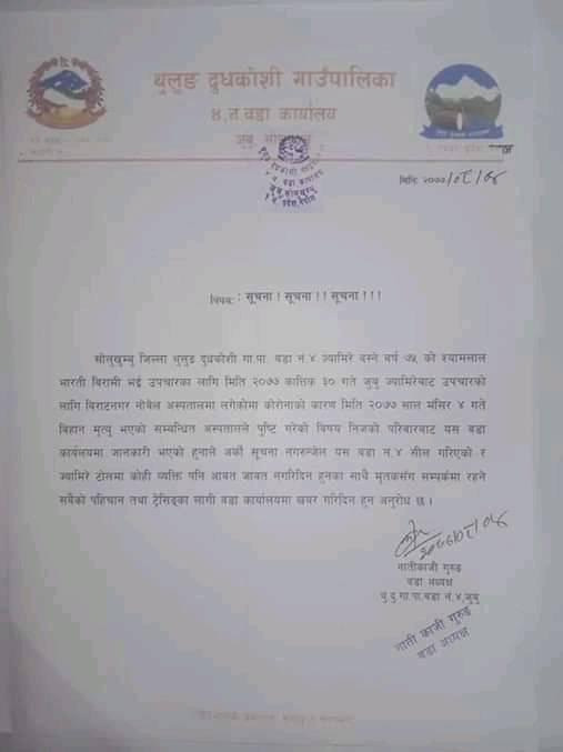 उपचारका क्रममा गरिएको कोरोना परिक्षणमा मृतक बृद्धमा कोरोना संक्रमण पुष्टि भएको थियो । उनको मृत्यु भएसँगै थुलुङ दुधकोशी गाउँपालिका ४ जुबुलाई शिल गरिएको हो। मृतकको सम्पर्कमा रहेकाको पहिचान गरी स्वाब संकलन गर्ने तयारी गरिएको वडाध्यक्ष नातिकाजी गुरुङले जानकारी दिनुभयो। अत्यावश्यक सेवा बाहेक अरु सबै कार्य बन्ध रहने वडाध्यक्ष गुरुङले बताउँनु भयो।