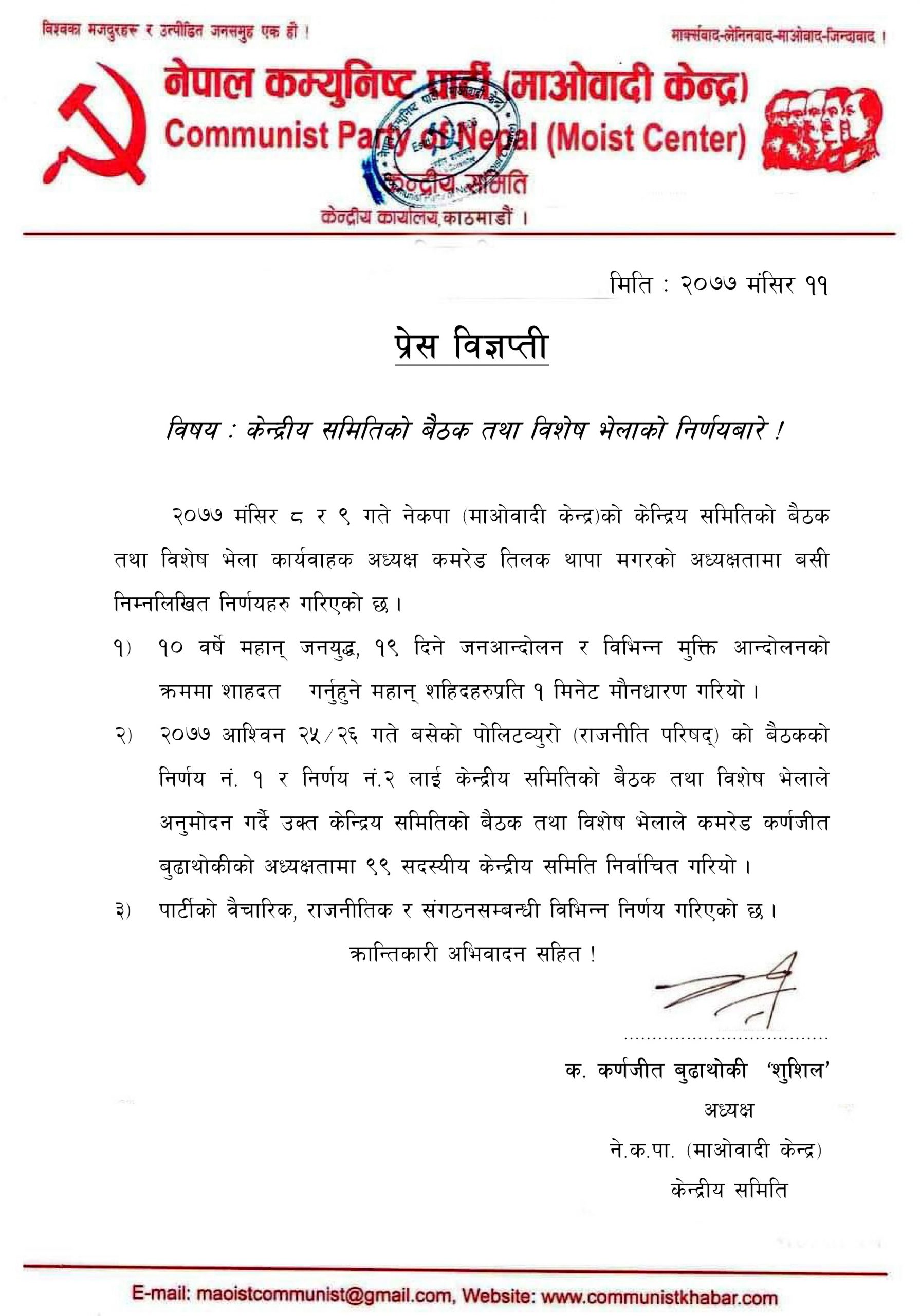 काठमाडौं । नेकपा (माओवादी केन्द्र) केन्द्रीय समितिको बैठक तथा विशेष भेला सम्पन्न भएको छ । काठमाडौंको जोरपाटीमा हालै सम्पन्न सो बैठकले भएको छ । बैठकले पार्टीको वैचाकि, राजनीतिक र संगठन सम्बन्धी विभिन्न निर्णय गरेको सो पार्टीका अध्यक्ष कर्णजीत बुढाथोकी ‘सुशील’द्वारा हस्ताक्षरित विज्ञप्तिमा जनाइएको छ ।