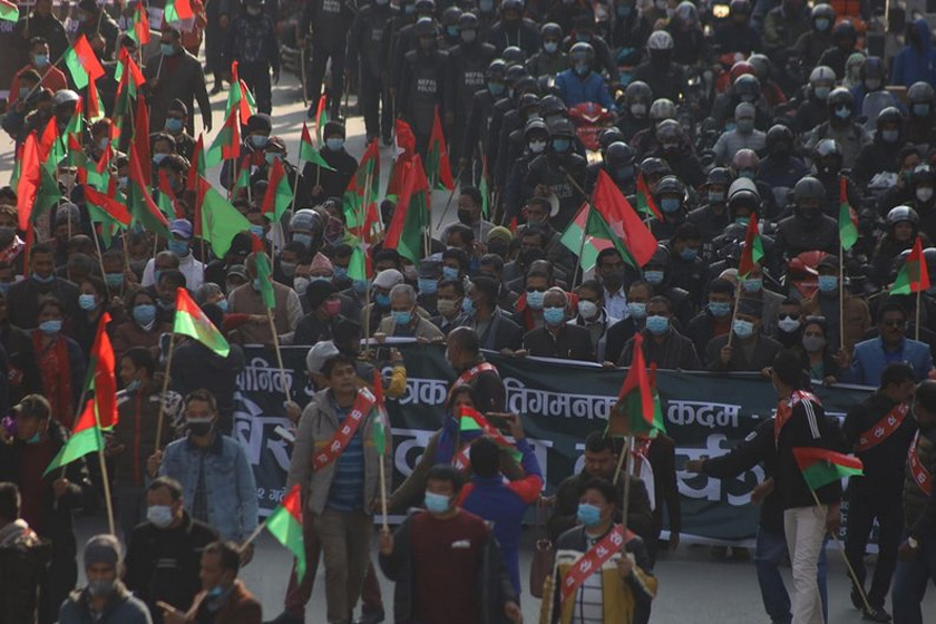 काठमाडौं,१२ पुस ।प्रधानमन्त्री केपी शर्मा ओलीको संसद विघटन गर्ने कदमविरुद्ध जनता समाजवादी पार्टी नेपालले काठमाडौंमा विरोध प्रदर्शन गरेको छ । आइतबार सो पार्टीले रत्नपार्क शान्तिबाटिका, पुतलीसडक हुँदै पुनः शान्ति बाटिकासम्म विरोध प्रदर्शन गरेको हो । अहिले प्रदर्शन जारी छ । प्रदर्शन शान्तिबाटिकामा पुगेर कोणसभामा परिणत हुने जनाइएको छ । कोणसभालाई पार्टीका बरिष्ठ नेता डा.बाबुराम भट्टराई, महन्थ ठाकुर लगायतले सम्बोधन गर्ने जनाइएको छ ।