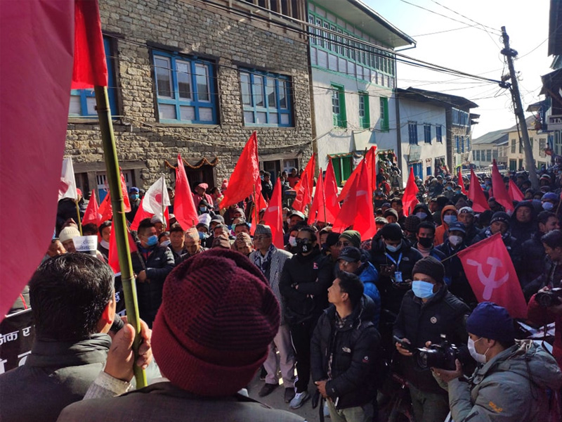 सोलुखुम्बु, १४ पुस। नेपाल कम्युनिस्ट पार्टी (नेकपा) प्रचण्ड – नेपाल समूहको निर्णय अनुसार मंगलबार उपत्यकालगायत मुलुक भरका जिल्ला सदरमुकामहरुमा संसद विघटन बिरुद्ध व्यापक प्रदर्शन गरिएको छ।