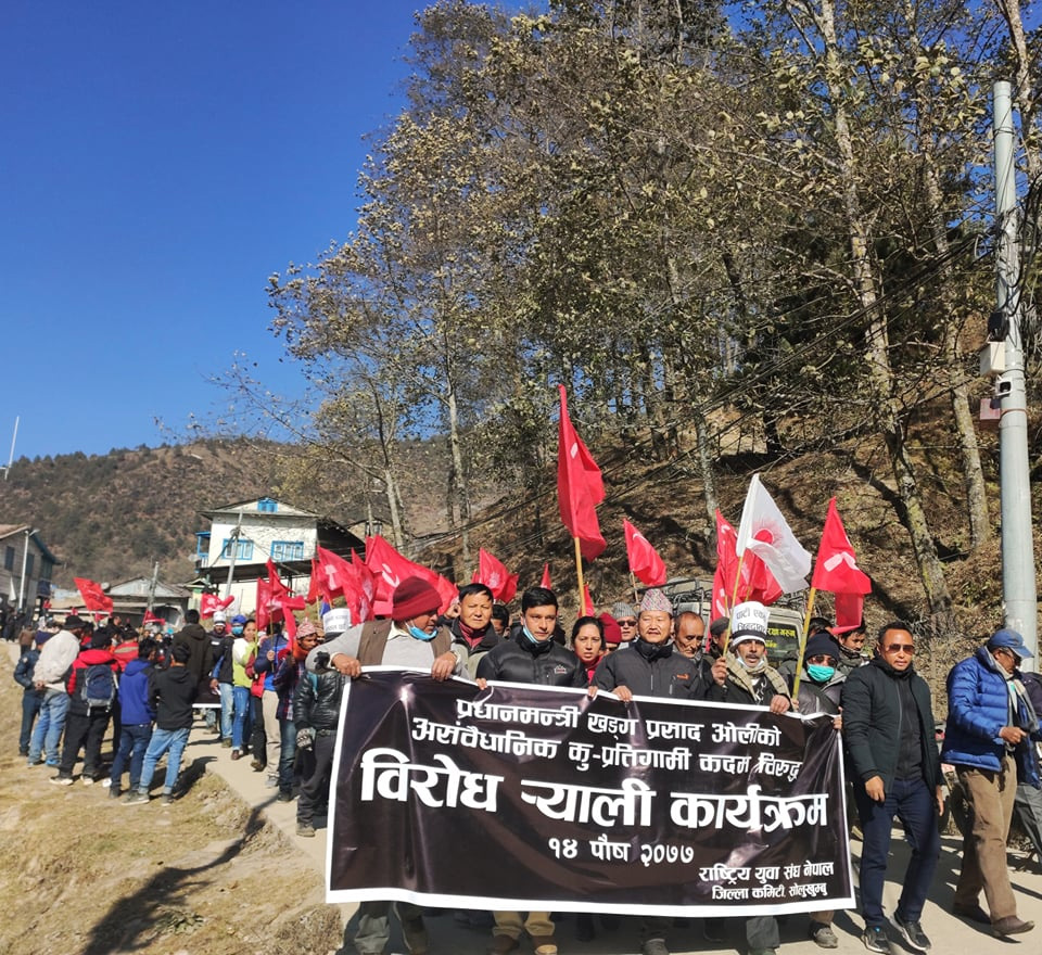 बिरोध कार्यक्रममा बोल्दै नेकपा सोलुखुम्बुका पुराना नेता शेर्पाले प्रधानमन्त्री र राष्ट्रपतिले संबिधान बिपरित गएर गरेको कार्यको आयु लामो नभएको दावी गर्नुभयो। बिरोध कार्यक्रममा ओलीको नाममा शङ्ख समेत बजाइएको छ । कोणसभा पश्चात् नेकपाको जिल्ला भेला तथा प्रशिक्षण कार्यक्रम समेत आयोजना गरिएको थियो ।