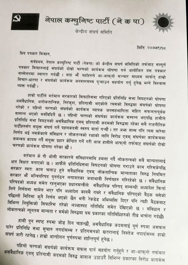 काठमाडौं, १८ पौष । नेपाल कम्युनिस्ट पार्टीको प्रचण्ड समूहले दोस्रो चरणको आन्दोलनको कार्यक्रम घोषणा गरेको छ । शनिबार पत्रकार सम्मेलन गरी कार्यक्रम सार्वजनिक गरेको हो ।
