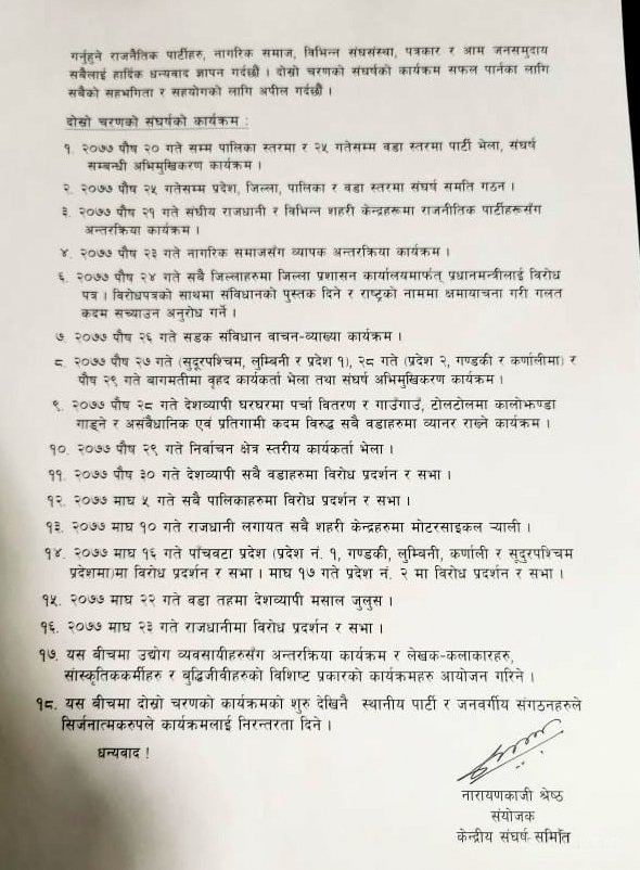 कार्यक्रम अनुसार २० पौष सम्म पालिका स्तरमा भेला, २५ गतेसम्म प्रदेश स्तरमा संघर्ष समिति गठन गने जनाइएको छ ।