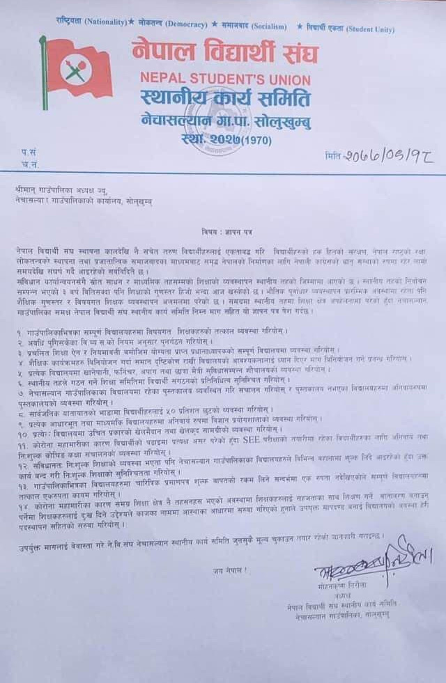 सोलुखुम्बु, १७ पुस। नेपाल विद्यार्थी संघ स्थानीय समिति नेचासल्यान गाउपालिकाले स्थानीय तहले शिक्षा क्षेत्रको ब्यबस्थापन सम्हाले यता विद्यालय शिक्षा झन लथालिङ्ग भएको भन्दै तत्काल सुधारका कदम चाल्न गाउँपालिकाको ध्यानाकर्षण गराएको छ।