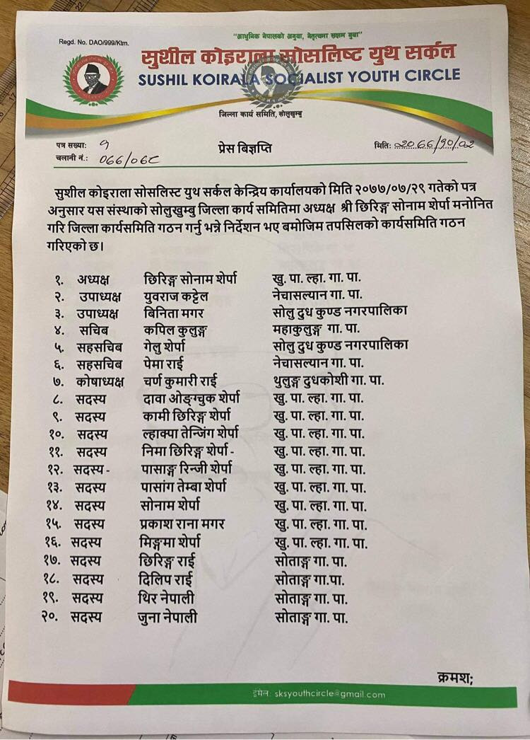 सोलुखुम्बु,२ माघ । सुशील कोइराला सोसलिष्ट युथ सर्कल सोलुखुम्बुले पूर्णता पाएको छ।सर्कल सोलुखुम्बुको अध्यक्षको जिम्मेवारी पाएका छिरिङसोनाम शेर्पाले पदाधिकारी तथा सदस्यहरुको मनोनयन गरेसंगै सो समितिले पूर्णता पाएको हो।