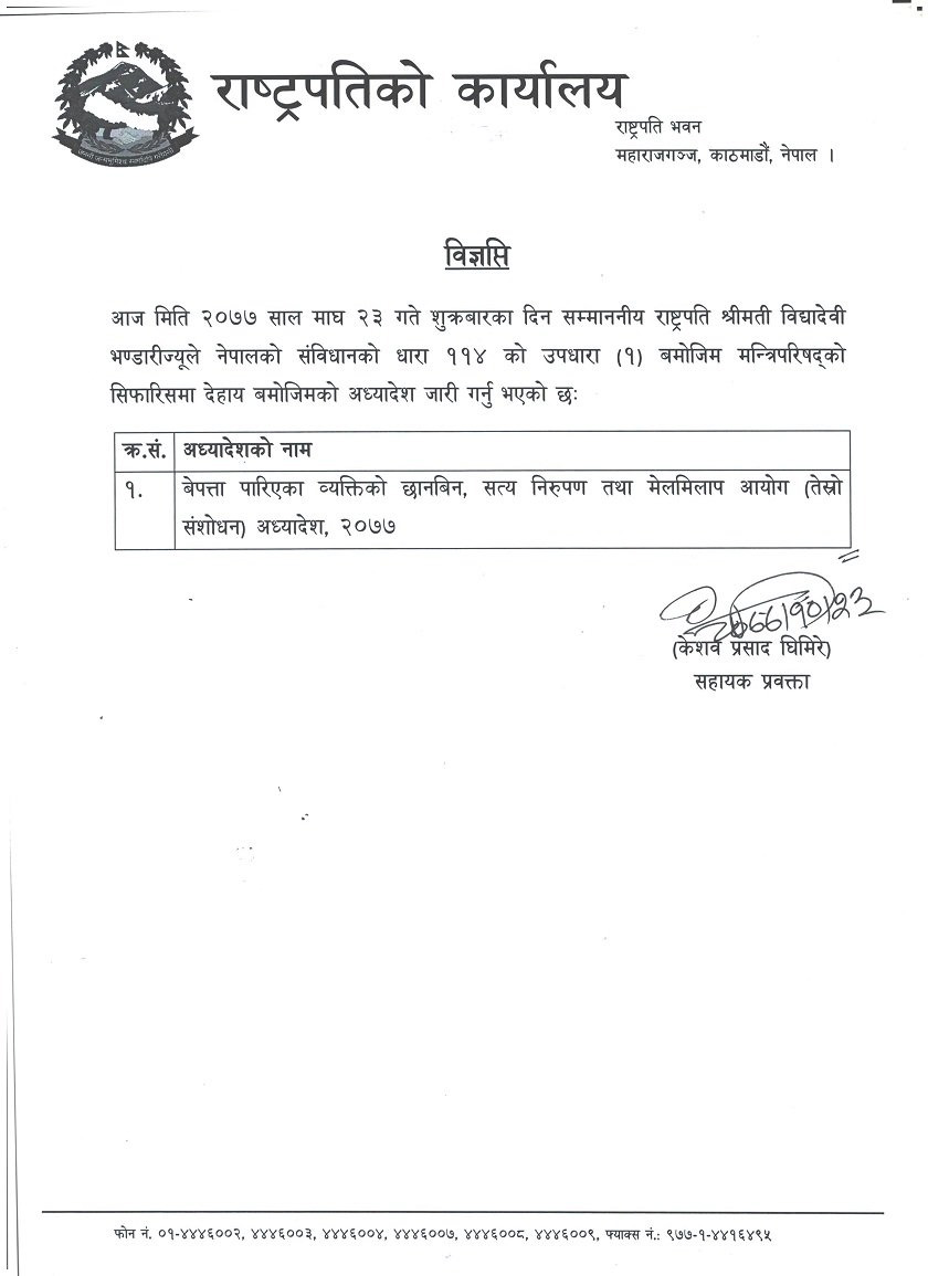 सरकारले बेपत्ता परिएका व्यक्तिको छानविन, सत्यनिरुपण तथा मेलमिलाप आयोग (तेश्रो संशोधन) अध्यादेश, २०७७ ल्याएको हो । उक्त अध्यादेशलाई राष्ट्रपति विद्यादेवी भण्डारीरीले शुक्रबारै जारी गरेकी छिन् ।