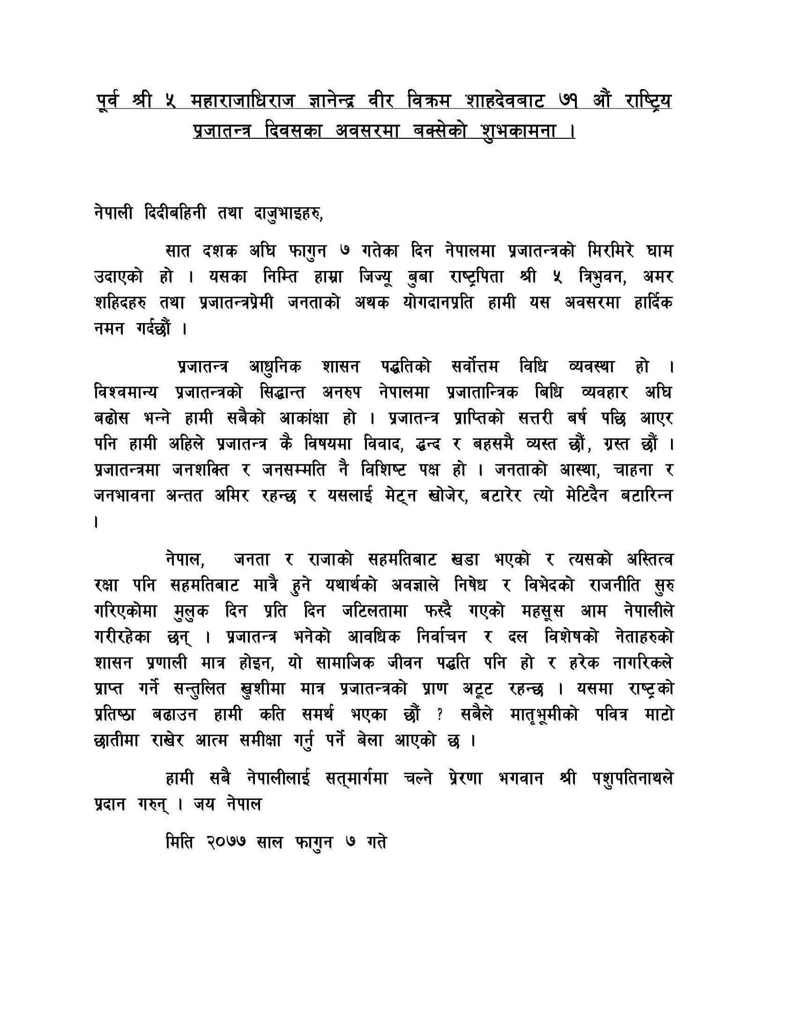 ‘प्रजातन्त्र आधुनिक शासन पद्धतिको सर्वोत्तम विधि व्यवस्था हो,’ पूर्व राजा ज्ञानेन्द्र वीर विक्रम शाहदेवबाट जारी सन्देशमा भनिएको छ, ‘प्रजातन्त्रमा जनशक्ति र जनसम्मति नै विशिष्ट पक्ष हो। जनताको आस्था, चाहना र जनभावना अन्तत अमिर रहन्छ र यसलाई मेट्न खोजेर, बटारेर त्यो मेटिँदैन, बटारिन्न।’
