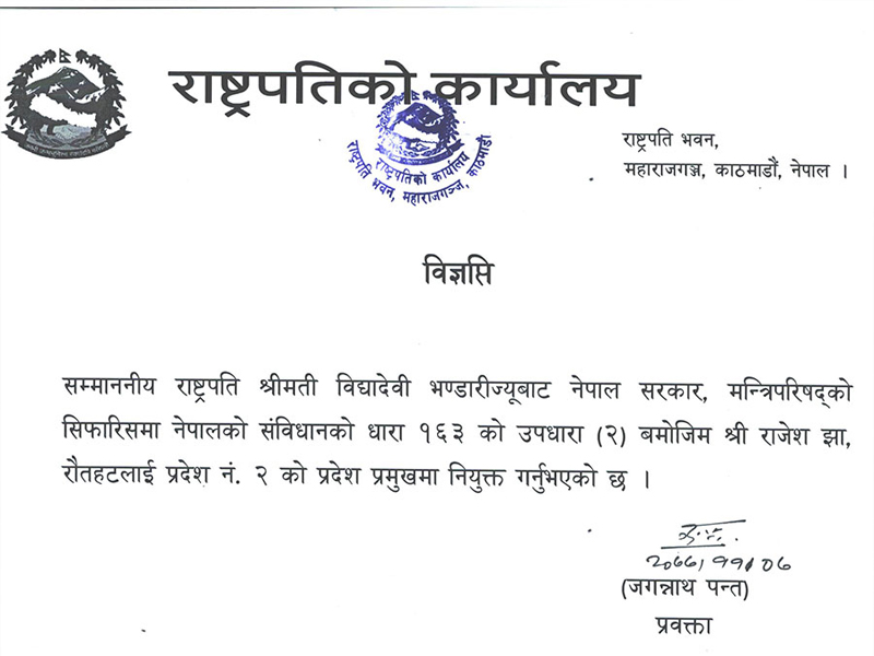 मन्त्रिपरिषदको सिफारिका आधारमा राष्ट्रपति भण्डारीले झालाई नियुक्त गरेकी हुन्। यसअघि रहेका प्रमुख तिलक परियारलाई पदमुक्त गरेपछि झालाई नियुक्त गरिएको हो।