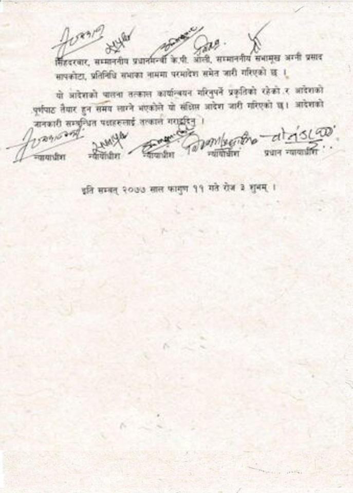 गत ५ पुसमा प्रधानमन्त्री केपी शर्मा ओलीले असंवैधानिक ढंगले संसद विघटन गर्न राष्ट्रपतिसमक्ष सिफारिस गरेका थिए।