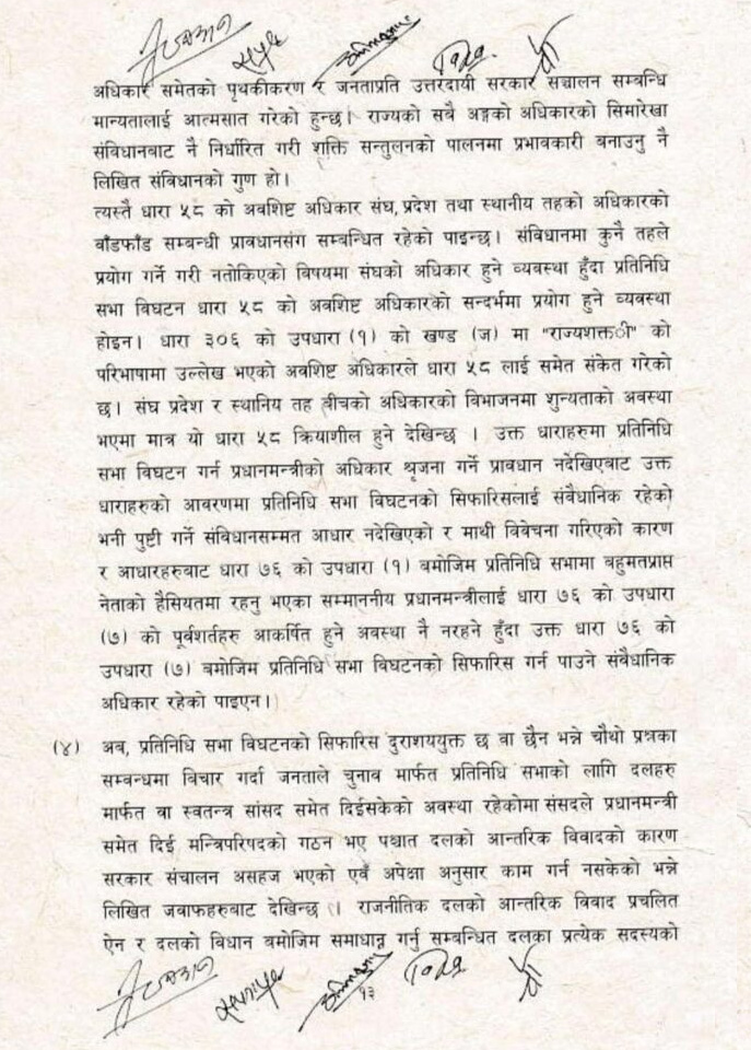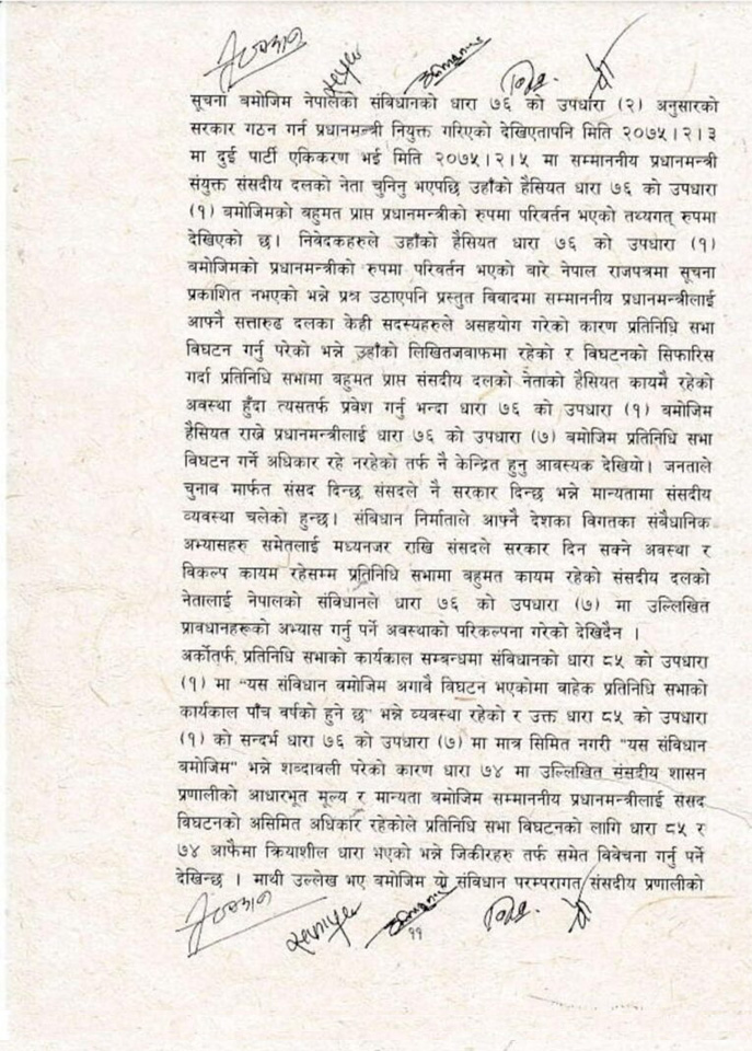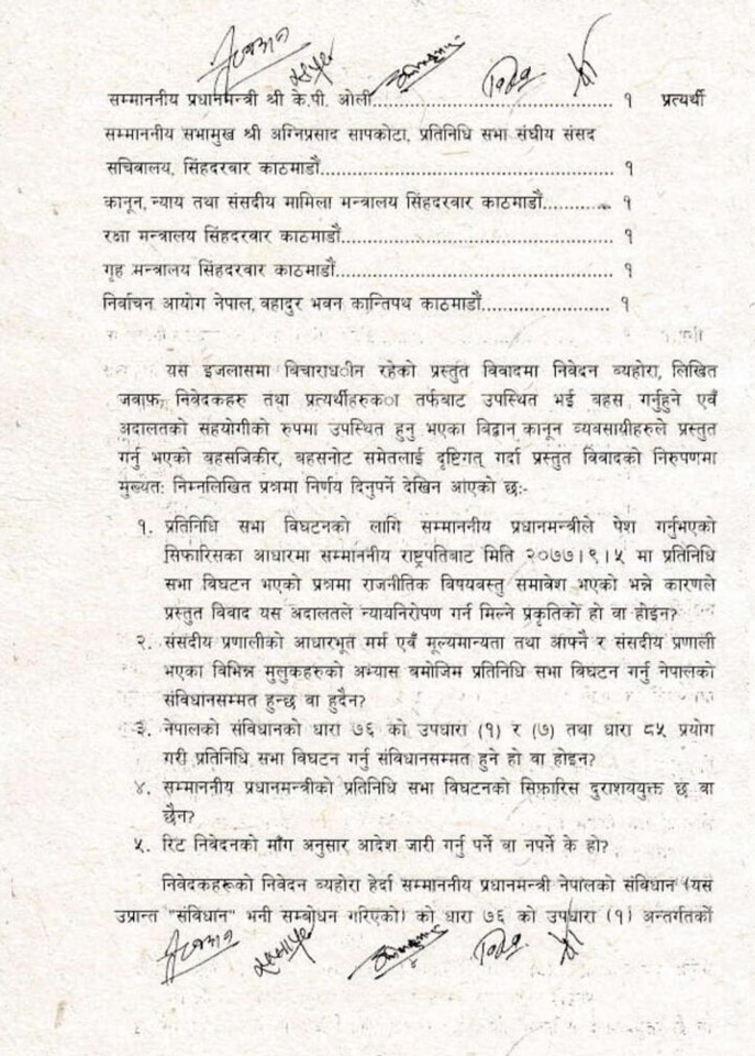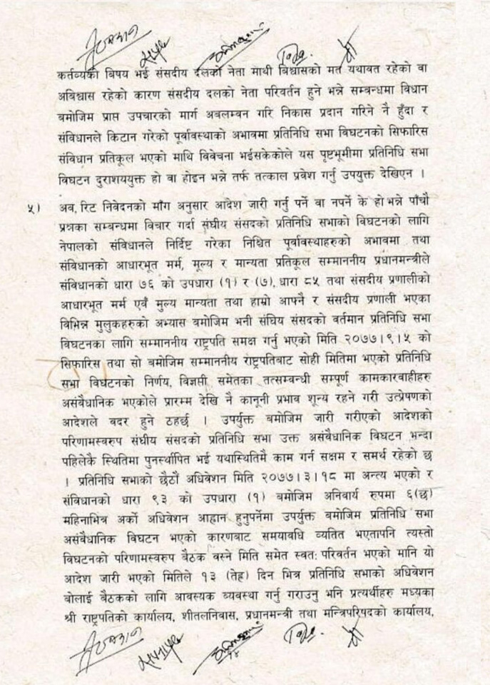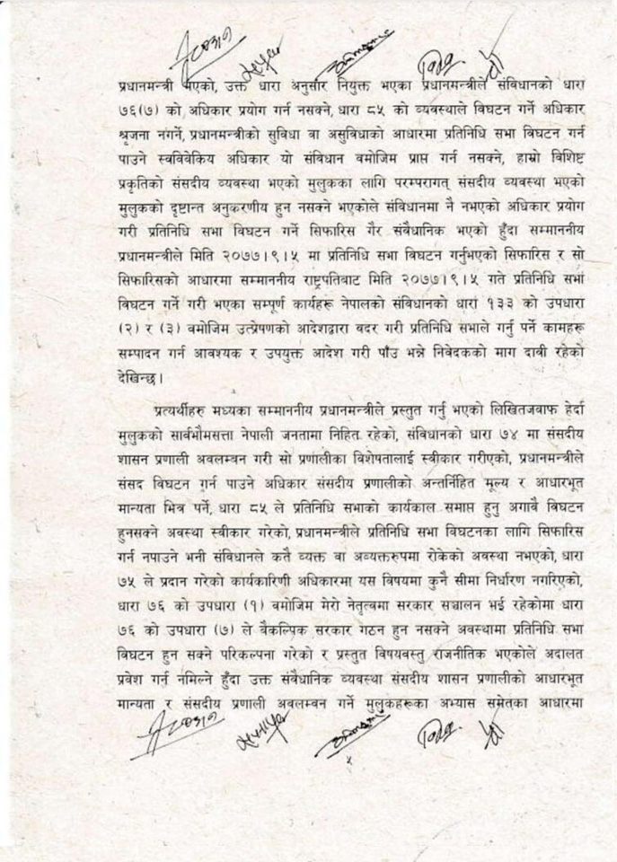 गत ५ पुसमा प्रधानमन्त्री केपी शर्मा ओलीले असंवैधानिक ढंगले संसद विघटन गर्न राष्ट्रपतिसमक्ष सिफारिस गरेका थिए।