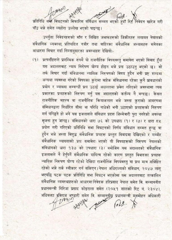 प्रधानन्यायाधीश चोलेन्द्र शमशेर जबरा, न्यायाधीशहरु विश्वम्भरप्रसाद श्रेष्ठ, अनिलकुमार सिन्हा, सपना प्रधान मल्ल र तेजबहादुर केसीको संवैधानिक इजलासले संसद विघटन बदर गर्ने आदेश दिएको हो।