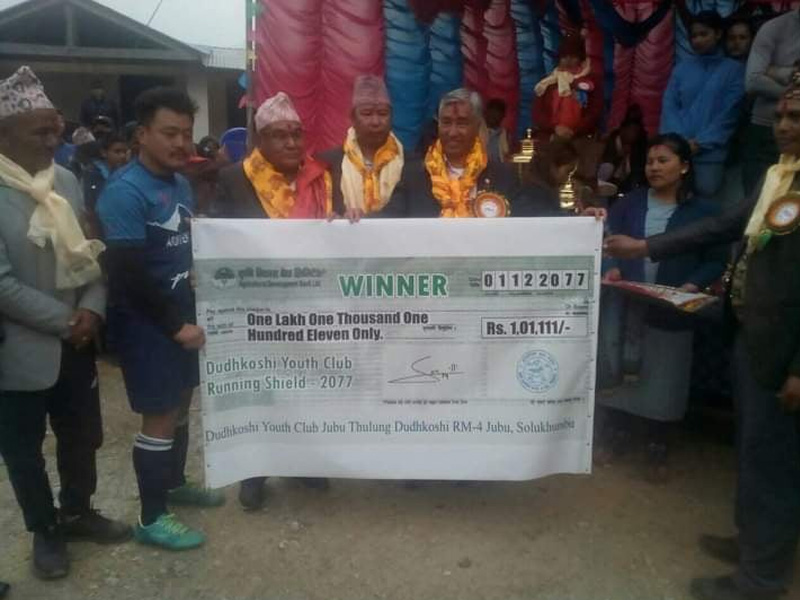 थुलुङ दुधकोशी : खुल्ला पुरुष फुटबल प्रतियोगिताका बिजयी खेलाडीहरु पुरस्कृत