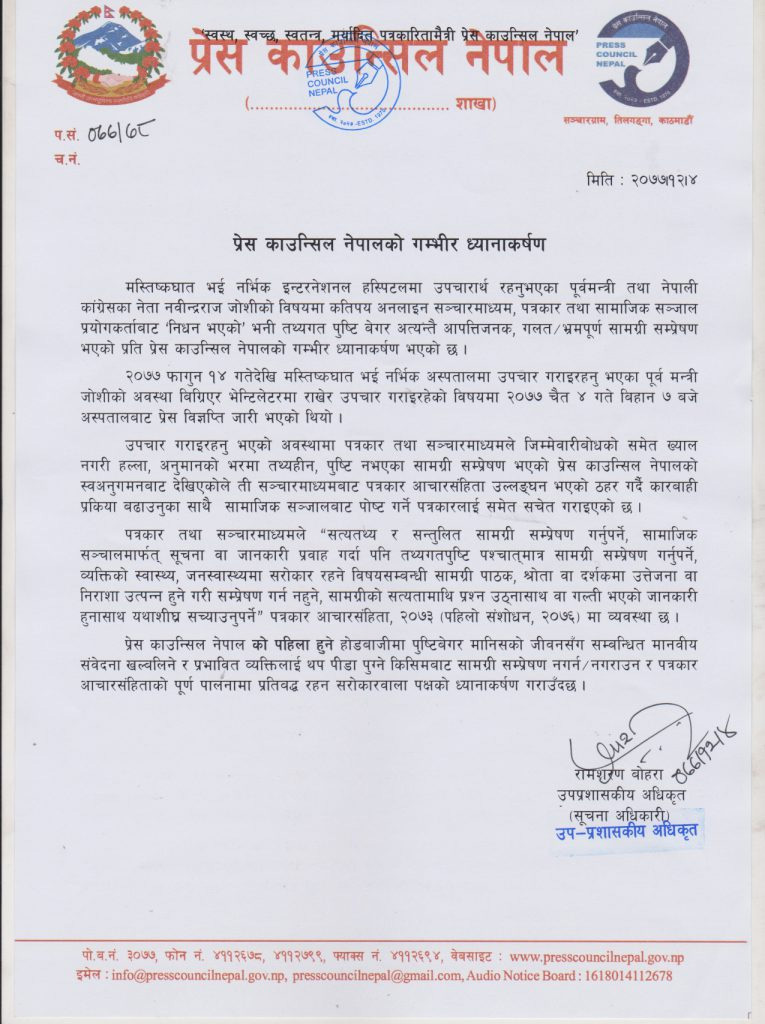 काउन्सिलका उपप्रशासकीय अधिकृत (सूचना अधिकारी) रामशरण बोहराद्धारा हस्ताक्षरित विज्ञप्तिमा पत्रकार तथा सञ्चारमाध्यमले जिम्मेवारीबोधको समेत ख्याल नगरी हल्ला र अनुमानका भरमा तथ्यहिन/पुष्टि नभएका सामग्री सम्प्रेषण भएको देखिएकाले त्यस्ता सञ्चारमाध्यमलाई कारबाही प्रकृया अगाडि बढाउनुका साथै सामाजिक सञ्जालबाट पोष्ट गर्ने पत्रकारलाई सचेत गराएको उल्लेख छ । को पहिला हुने भन्ने होडबाजीमा पुष्टिबेगर मानिसको जीवनसँग सम्बन्धित मानवीय संवेदना खल्बलिने र प्रभावितलाई थप पीडा पुग्ने गरी सामग्री सम्प्रेषण नगर्न र पत्रकार आचारसंहिता पूर्ण पालनामा प्रतिबद्ध रहन काउन्सिलले ध्यानाकर्षण गराएको छ ।