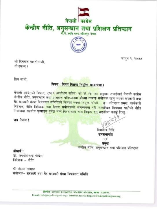 सोलुखुम्बु । नेपाल विद्यार्थी संघका नेता दिनराज बास्तोला नेपाली कांग्रेस केन्द्रीय नीति,अनुसन्धान तथा प्रशिक्षण प्रतिष्ठान अन्तर्गतको सरकारी तथा गैरसरकारी संस्था बिषयगत समितिको बिज्ञमा नियुक्त भएका छन।