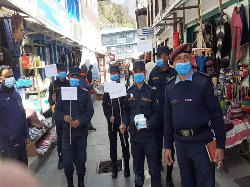 प्रहरी निरीक्षक महेश निरौलाको नेतृत्वमा सो चेतनामूलक कार्यक्रम संचालन भएको थियो भने प्रहरीको टोलीले स्थानीय सर्वसाधारण, व्यपारी, कर्मचारी, आन्तरिक तथा बाह्य पर्यटक सहितलाई अनिवार्य रुपमा माक्सको प्रयोग गरि कोरनाबाट आफू पनि बच्न र अरुलाई पनि बचाउन अनुरोध गरिरहेको पाइएको छ । यस्तै गरि सोलुखुम्बुका जिल्ला प्रहरी कार्यालय लगायत अन्य पालिकाहरुमा रहेका प्रहरी कार्यालयहरुमा पनि सो अभियान संचालन गरिएको छ ।