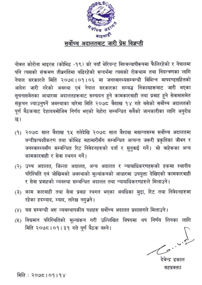 स्वास्थ्यसँग सम्बन्धित सेवा बाहेकका अन्य काम कारवाही स्थगित गर्ने निर्णय समेत गरेको छ। अदालतले एक प्रेस नोट जारी गर्दै भनेको छ, ‘२०७६ साल बैशाख १५ गतेदेखि २०७८ साल बैशाख मसान्तसम्म सर्वोच्च अदालतमा बन्दीप्रत्यक्षीकरण तथा कोभिड महामारीसँग सम्बन्धित अत्यन्त जरूरी प्रकृतिका जीवन र जनस्वास्थ्यसँग सम्बन्धित रिट निवेदनहरूको दर्ता र सुनुवाई गर्ने। सो बाहेकका अन्य कामकारबाही र सेवा स्थगन गर्ने।’