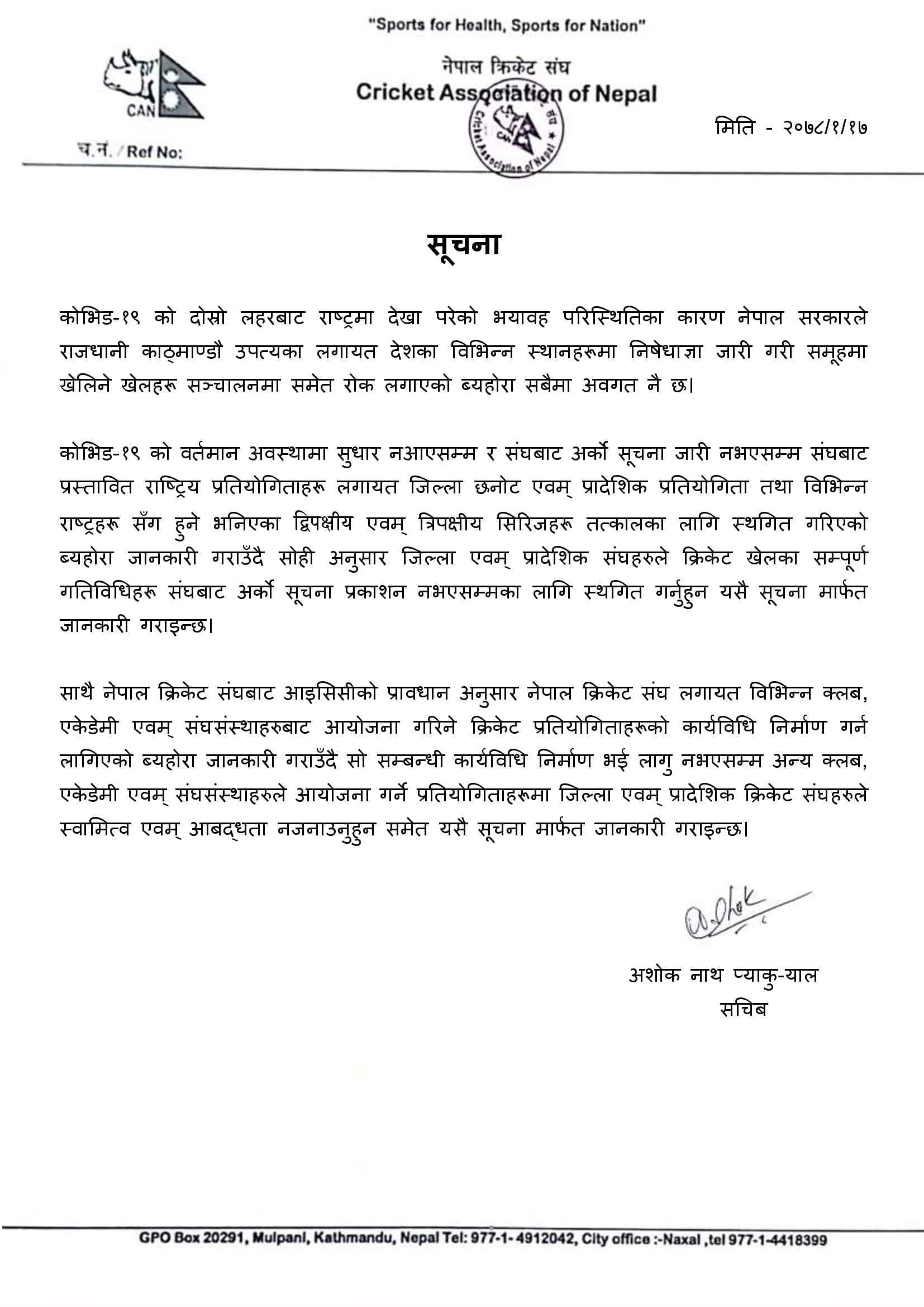 क्यानले शुक्रवार एक सूचना प्रकाशित गर्दै अर्को सूचना नआएसम्मका लागि सबै क्रिकेट गतिविधि बन्द गर्ने निर्णय गरेको हाे ।