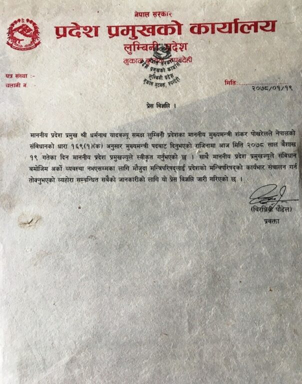 लुम्बिनी प्रदेशका मुख्यमन्त्री पोखरेलले दिएको राजीनामा स्वीकृत