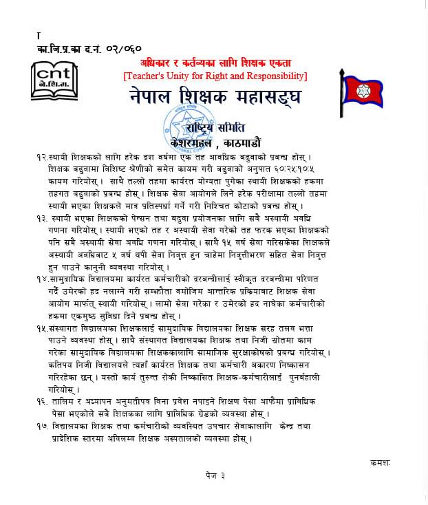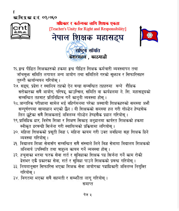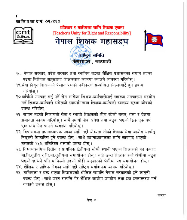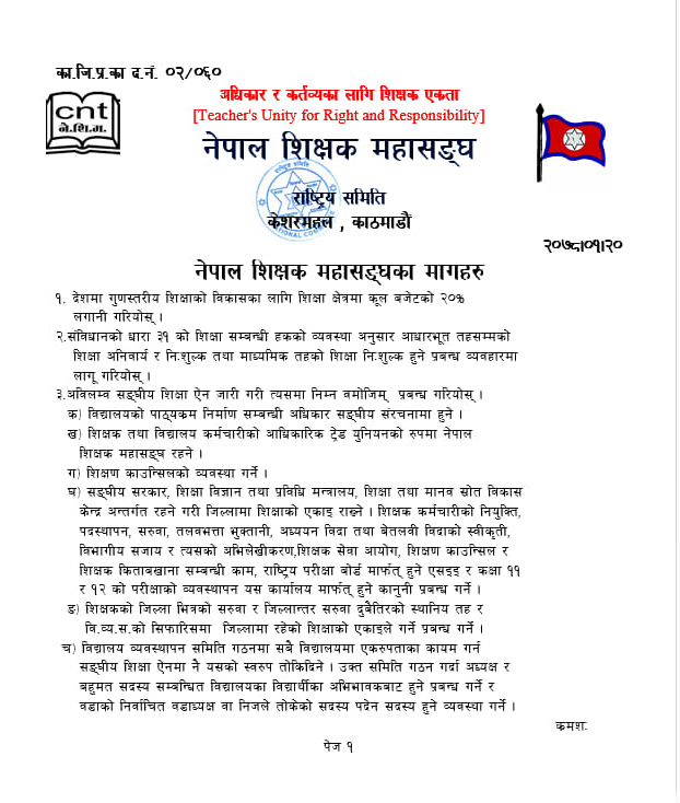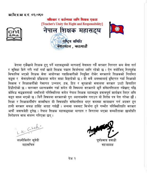 महासङ्घ राष्ट्रिय समितिका सह-अध्यक्ष पूर्णप्रसाद दवाडी र महासचिव लक्ष्मीकिशोर सुवेदीद्वारा हस्ताक्षरित बिरोधपत्रमा शिक्षकका पेसागत समस्याहरु समेटिएका छन् ।
