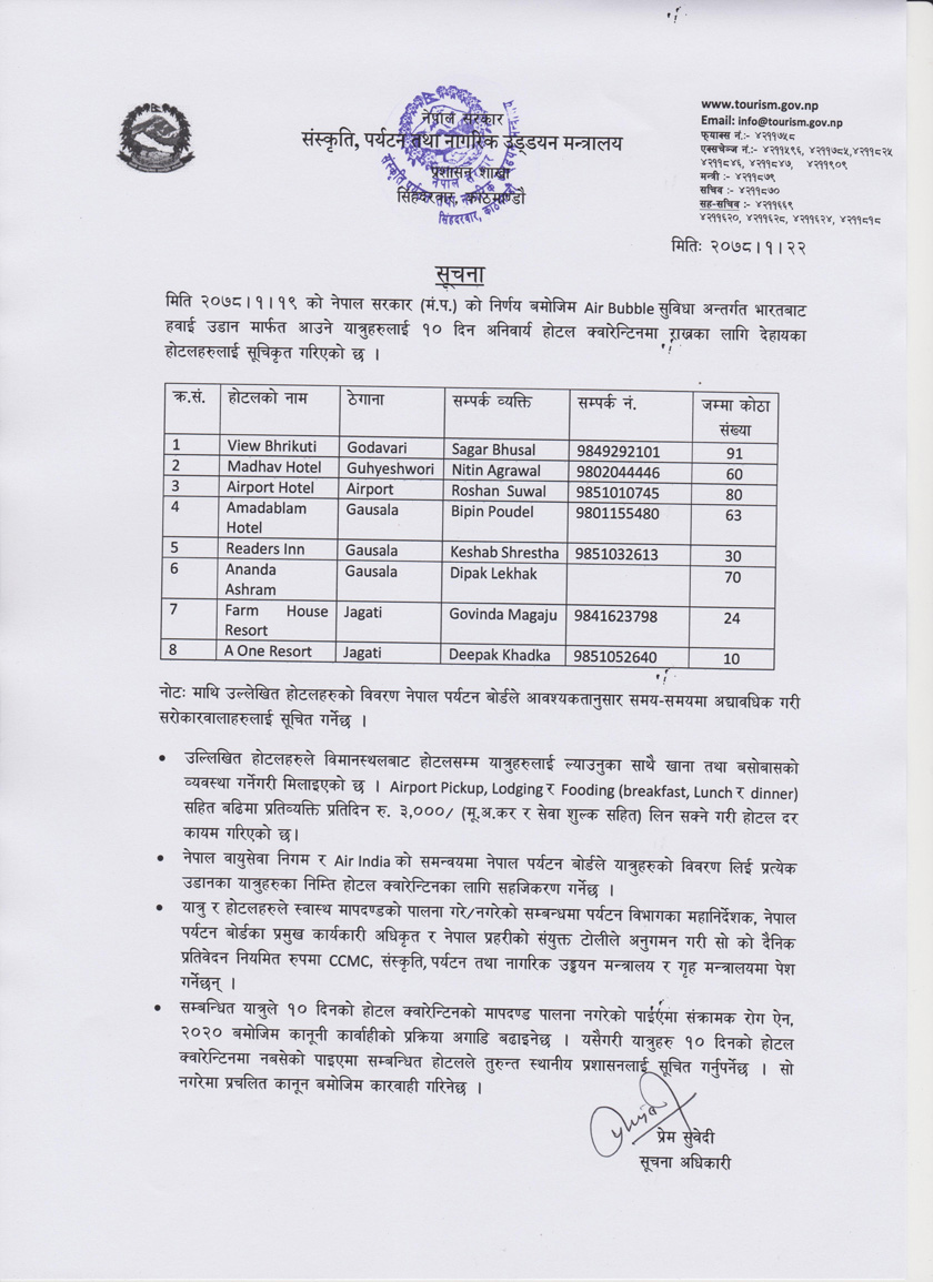 होटल क्वारेन्टिन अनिवार्य गरेका छौँ : पर्यटन मन्त्रालय