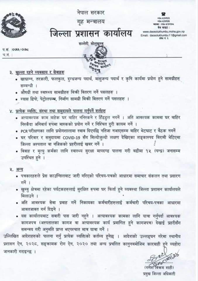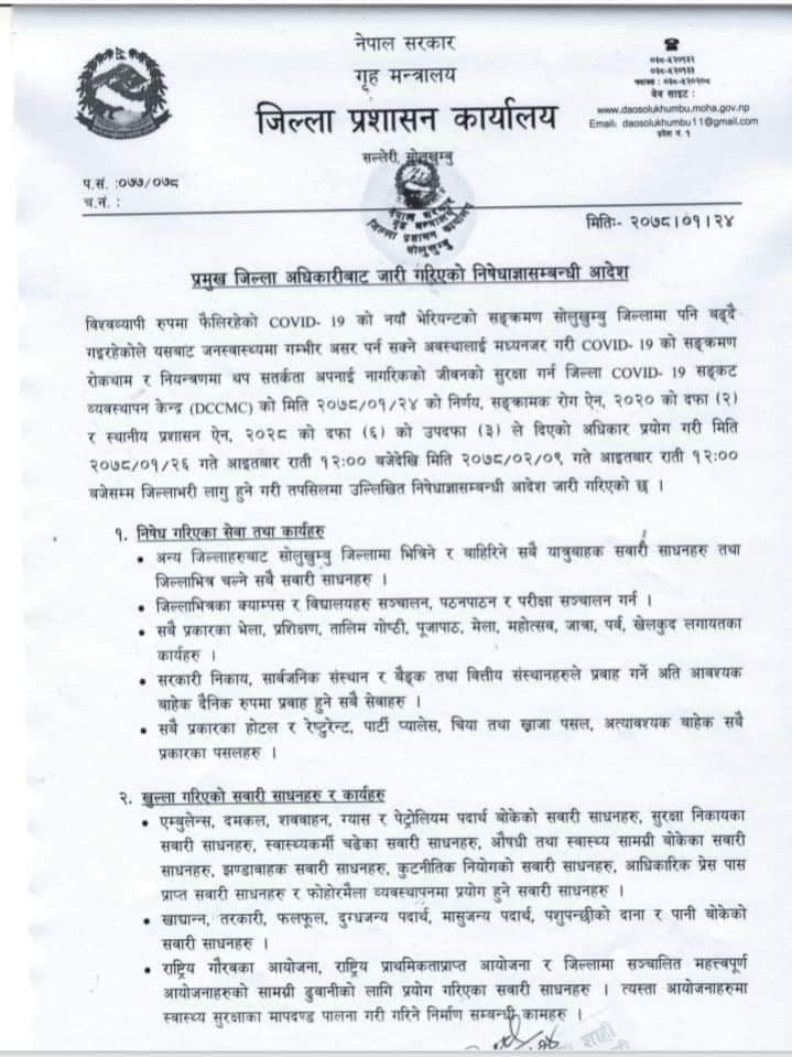 सोलुखुम्बु : के छ प्रमुख जिल्ला अधिकारीद्वारा जारी निषेधाज्ञा सम्बन्धि आदेशमा ? (पूर्णपाठ)