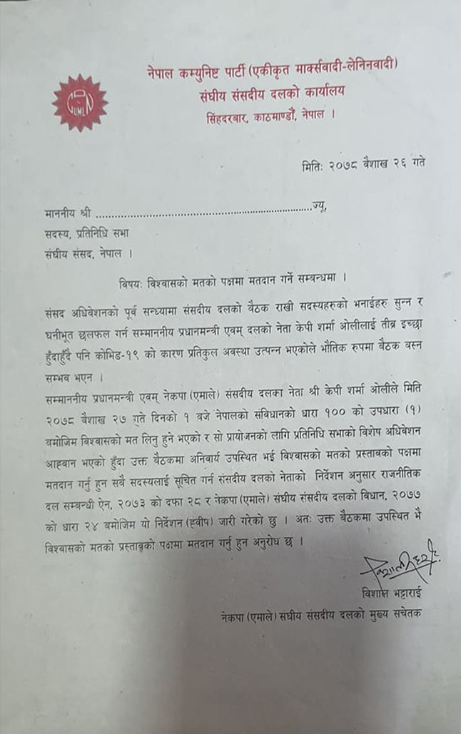 “सम्माननीय प्रधानमन्त्री एवम् नेकपा (एमाले) संसदीय दलका नेता श्री केपी शर्मा ओलीले मिति २०७८ वैशाख २७ गते दिनको १ बजे नेपालको संविधानको धारा १०० को उपधारा (१) वमोजिम विश्वासको मत लिनु हुने भएको र सो प्रायोजनको लागि प्रतिनिधि सभाको विशेष अधिवेशन आह्वान भएको हुँदा उक्त बैठकमा अनिवार्य उपस्थित भई विश्वासको मतको प्रस्तावको पक्षमा मतदान गर्नु हुन सबै सदस्यलाई सूचित गर्न संसदीय दलको नेताको निर्देशन अनुसार राजनीतिक दल सम्बन्धी ऐन, २०७३ को दफा २८ र नेकपा (एमाले) संघीय संसदीय दलको विधान, २०७७ को धारा २४ बमोजिम यो निर्देशन (ह्विप) जारी गरेको छु । अतः उक्त बैठकमा उपस्थित भै विश्वासको मतको प्रस्तावको पदामा मतदान गर्नु हुन अनुरोध छ,“ भट्टराईले जारी गरेको ह्वीपमा भनिएको छ ।