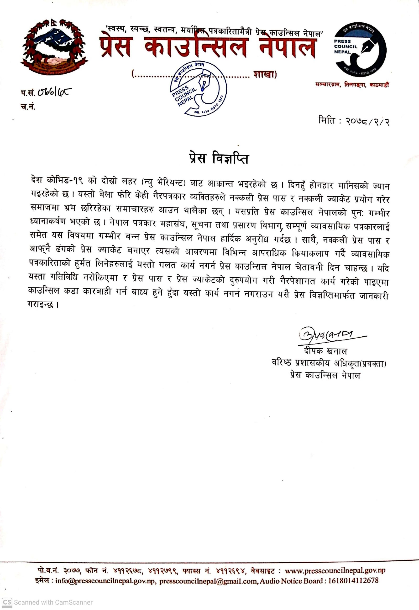 ‘नक्कली प्रेस पास र आफ्नै ढंगको प्रेस ज्याकेट बनाएर त्यसको आवरणमा विभिन्न आपराधिक क्रियाकलाप गर्दै व्यावसायिक पत्रकारिताको हुर्मत लिनेहरूलाई यस्तो गलत कार्य नगर्न प्रेस काउन्सिल नेपाल चेतावनी दिन चाहन्छ,’ विज्ञप्तिमा भनिएको छ, ‘यदि यस्ता गतिविधि नरोकिएमा र प्रेस पास र प्रेस ज्याकेटको दुरुपयोग गरी गैरपेशागत कार्य गरेको पाइएमा काउन्सिल कडा कारवाही गर्न बाध्य हुने हुँदा यस्तो कार्य नगर्न नगराउन यसै प्रेस विज्ञप्तिमार्फत जानकारी गराइन्छ ।’