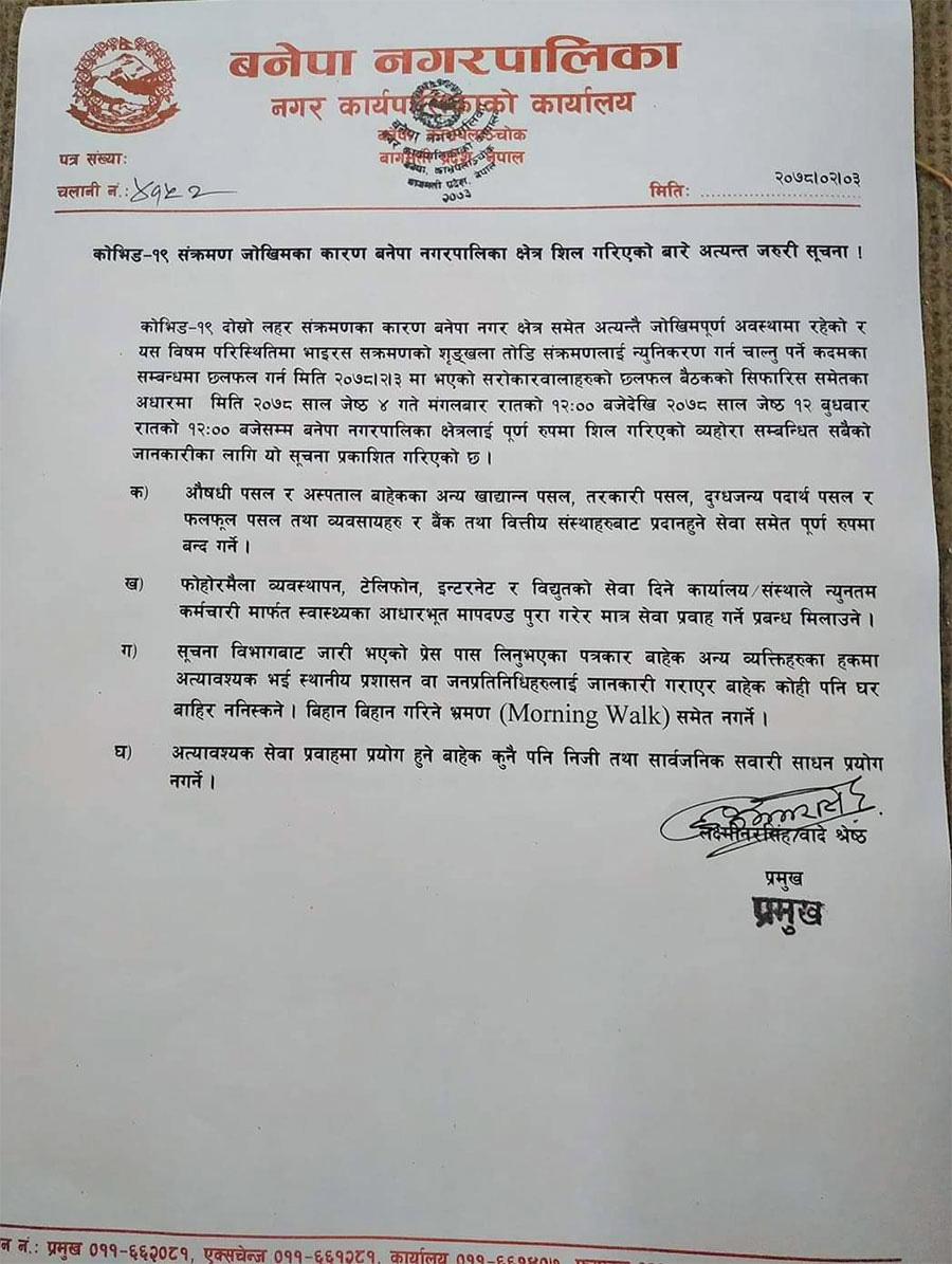 नगरपालिकाले सोमबार जारी गरेको विज्ञप्तिमा भनिएको छ, ‘कोभिड १९ संक्रमण जोखिमका कारण बनेपा नगर क्षेत्रसमेत अत्यन्तै जोखिमपूर्ण अवस्थामा रहेकोले यस विषम परिस्थितिमा भाइरसको शृङ्खला तोडी संक्रमणलाई न्यूनिकरण गर्न मिति २०७८/०२/४ गते मंगलबार राति १२ बजेदेखि २०७८/०२/१२ गते बुधबार राति १२ बजेसम्म बनेपाल नगरपालिका क्षेत्रलाई पूर्ण रूपमा सिल गरिएको व्यहोरा सम्बन्धित सबैको जानकारीको लागि यो सूचना प्रकाशित गरिएको छ ।’