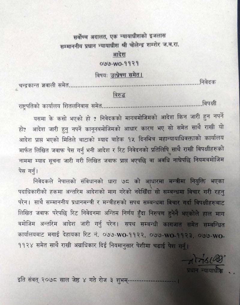 चारै रिटमाथि सुनुवाइ गर्दै प्रधानन्यायाधीश जबराले अन्तरिम आदेश दिन अस्वीकार गरेका हुन्। आदेशमा भनिएको छ, “सम्माननीय प्रधानमन्त्री र मन्त्रीहरूको शपथ सम्बन्धमा विचार गर्दा विपक्षीहरूबाट लिखित जवाफ परेपछि रिट निवेदनमा अन्तिम निर्णय हुँदा निरूपण हुने नै भएकोले हाल माग बमोजिम अन्तरिम आदेश जारी गर्नु परेन।”