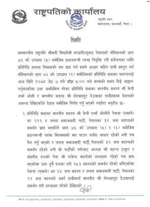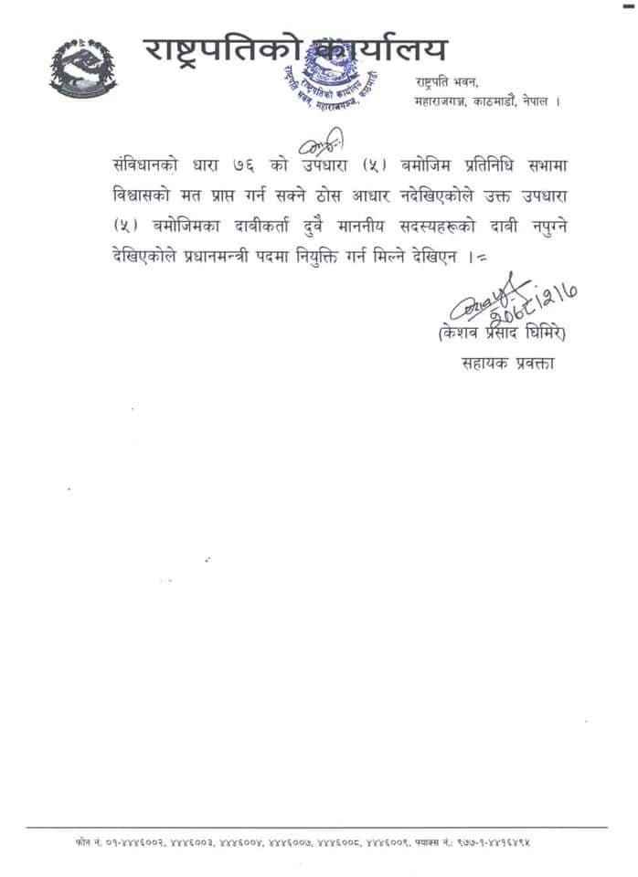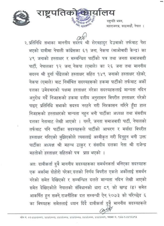 राष्ट्रपति कार्यालयले शुक्रबार राति जारी गरेको विज्ञप्तिमा उल्लेख छ, ‘दाबीमा सम्बन्धित दलले मान्यता नदिन लेखी आएको समेत देखिएकाले संविधानको धारा ८९ को खण्ड (ङ) समेत आकर्षित हुन सक्ने, राजनीतिक दलसम्बन्धी ऐन, २०७३ को परिच्छेद ६ का विषय समेतलाई ध्यान दिँदै दाबीकर्ता दुवै माननीय सदस्यहरूले संविधानको धारा ७६ को उपधारा (५) बमोजिम प्रतिनिधिसभामा विश्वासको मत प्राप्त गर्न सक्ने ठोस आधार नदेखिएकोले उक्त उपधारा (५) बमोजिमका दाबीकर्ता दुवै माननीय सदस्यहरूको दाबी नपुग्ने देखिएकोले प्रधानमन्त्री पदमा नियुक्ति गर्न मिल्ने देखिएन।’
