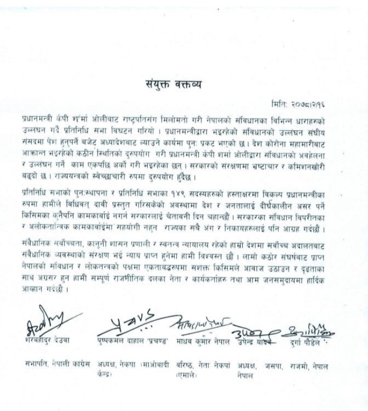कांग्रेस सभापति शेरबहादुर देउवा,माओवादी केन्द्रका अध्यक्ष पुष्पकमल दाहाल,पूर्ब एमाले नेता माधव नेपाल,जसपा अध्यक्ष उपेन्द्र यादव, र जनमोर्चाकि दुर्गा पौडेलद्वारा हस्ताक्षरित बिज्ञप्तिमा संवैधानिक सर्वोच्चता, कानूनी शासन प्रणाली र स्वतन्त्र न्यायालय रहेको देशमा सर्वोच्च अदालतबाट संवैधानिक व्यवस्थाको संरक्षण भई न्याय प्राप्त हुनेमा आफूहरु विश्वस्त भएको उनीहरुले उल्लेख गरेका छन्।