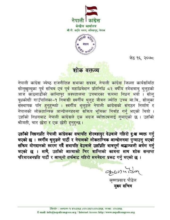 थुलुङको निधनमा कांग्रेस सभापति देउवाद्वारा दु:ख व्यक्त