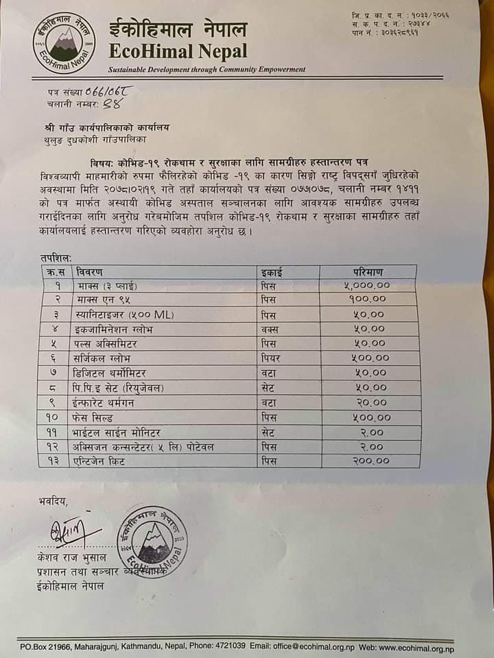कोरोना भाइरसविरुद्ध प्रयोग हुने उल्लेखित रकम बराबरको स्वास्थ्य सामाग्री इको-हिमाल नेपाल र सिद्धार्थ बनस्थली ग्रुपबाट प्राप्त भएको गाउँपालिका अध्यक्ष असिम थुलुङले जानकारी दिए।
