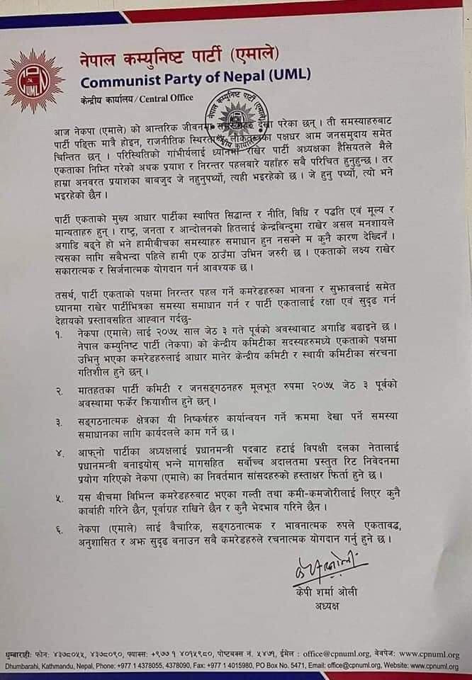ओलीद्वारा पार्टी एकताका लागि आइतबार गरिएको प्रस्तावमा विपक्षी दलको नेतालाई प्रधानमन्त्री बनाउन गरेको हस्ताक्षर र मागसहित सर्वोच्च अदालतमा प्रस्तुत रिट निवेदनमा भएको हस्ताक्षर फिर्ता गर्नुपर्ने शर्त भने अगाडि सारेका छन्। साथै उनले पार्टीभित्र भएका गल्ती र कमीकमजोरीलाई लिएर कुनै कारवाही नगरिने र पूर्वाग्रह नराख्नेसमेत प्रतिवद्धता जनाएका छन् ।