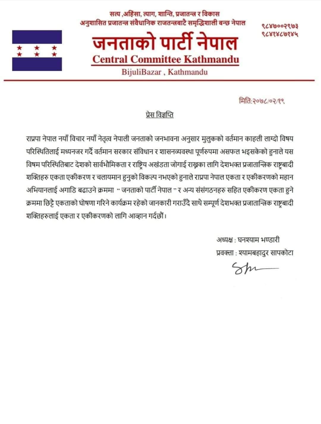जनताको पार्टी नेपालका अध्यक्ष घनश्याम भण्डारी र प्रवक्ता श्यामबहादुर सापकोटाले एक विज्ञप्ती प्रकाशित गरी देशको सार्वभौमिकता, राष्ट्रिय अखण्डता जोगाइराख्नका लागि देशभक्त प्रजातान्त्रिक शक्तिहरु एकता एकीकरण र चलायमान हुनुको विकल्प नभएकोले राप्रपा नेपालसँग एकता गर्न लागेको जनाएको छ । जनताको पार्टी नेपालले सत्य, अहिंसा, त्याग, शान्ति, प्रजातन्त्र र विकास, अनुशासित प्रजातन्त्र संवैधानिक राजतन्त्रबाटै समृद्धिशाली बन्छ नेपाल’ भन्ने मूल नारालाई आत्मसात गरेको छ ।