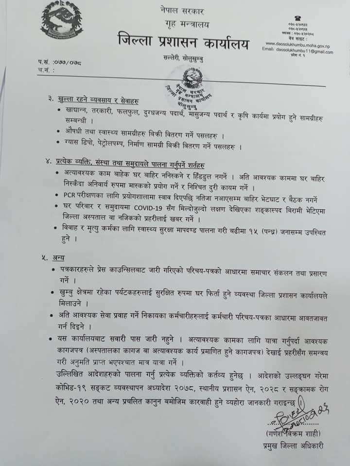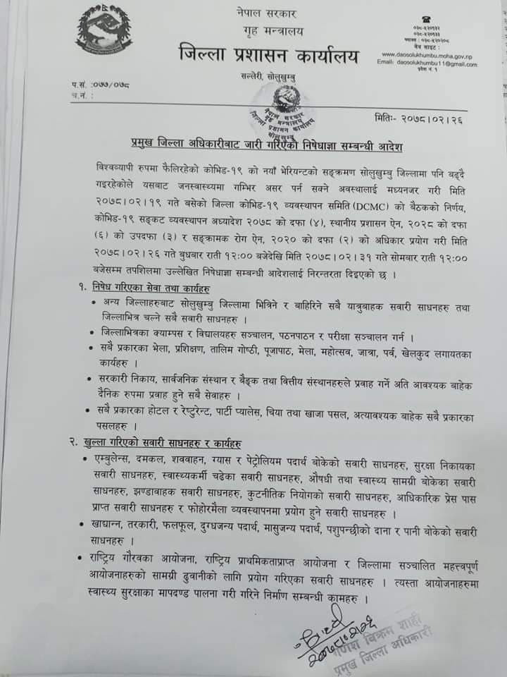 सोलुखुम्बु।जिल्ला प्रशासन कार्यालय सोलुखुम्बुले थप पांछ दिन निषेधाज्ञालाई निरन्तरता दिने निर्णय गरेको छ।