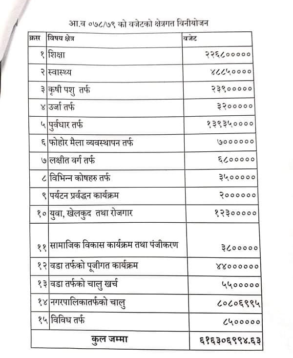 नगरपालिकाका मेयर नाम्गेल जाङ्बु शेर्पाका अनुसार कुल बजेट ६१ करोड ६३ लाख ६ हजार ९ सय ९४.६३ पैसा बजेटमध्ये शिक्षातर्फ २ करोड २६ लाख ८० हजार, स्वास्थ्य तर्फ ४ करोड ८८ लाख ५० हजार, कृषि पशुतर्फ २ करोड ३९ लाख, पूर्वाधारतर्फ १३ करोड ९३ लाख ३५ हजार बजेट विनियोजन गरिएको छ।