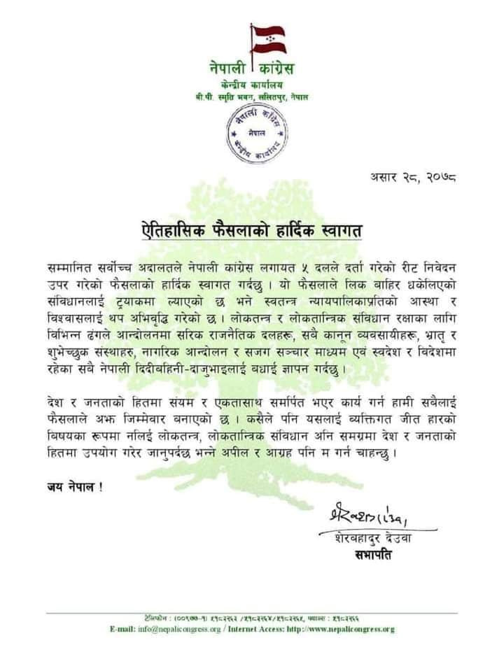 नेपाली कांग्रेसका सभापति शेरबहादुर देउवाले सोमबार प्रेस विज्ञप्ति जारी गर्दै सर्वोच्चको फैसलालाई कसैले पनि व्यक्तिगत जित हारको विषयका रुपमा नलिई लोकतन्त्र, लोकतान्त्रिक संविधान अनि समग्रमा देश र जनताको हितमा उपयोग गरेर जानुपर्नेमा जोड दिएका छन् ।