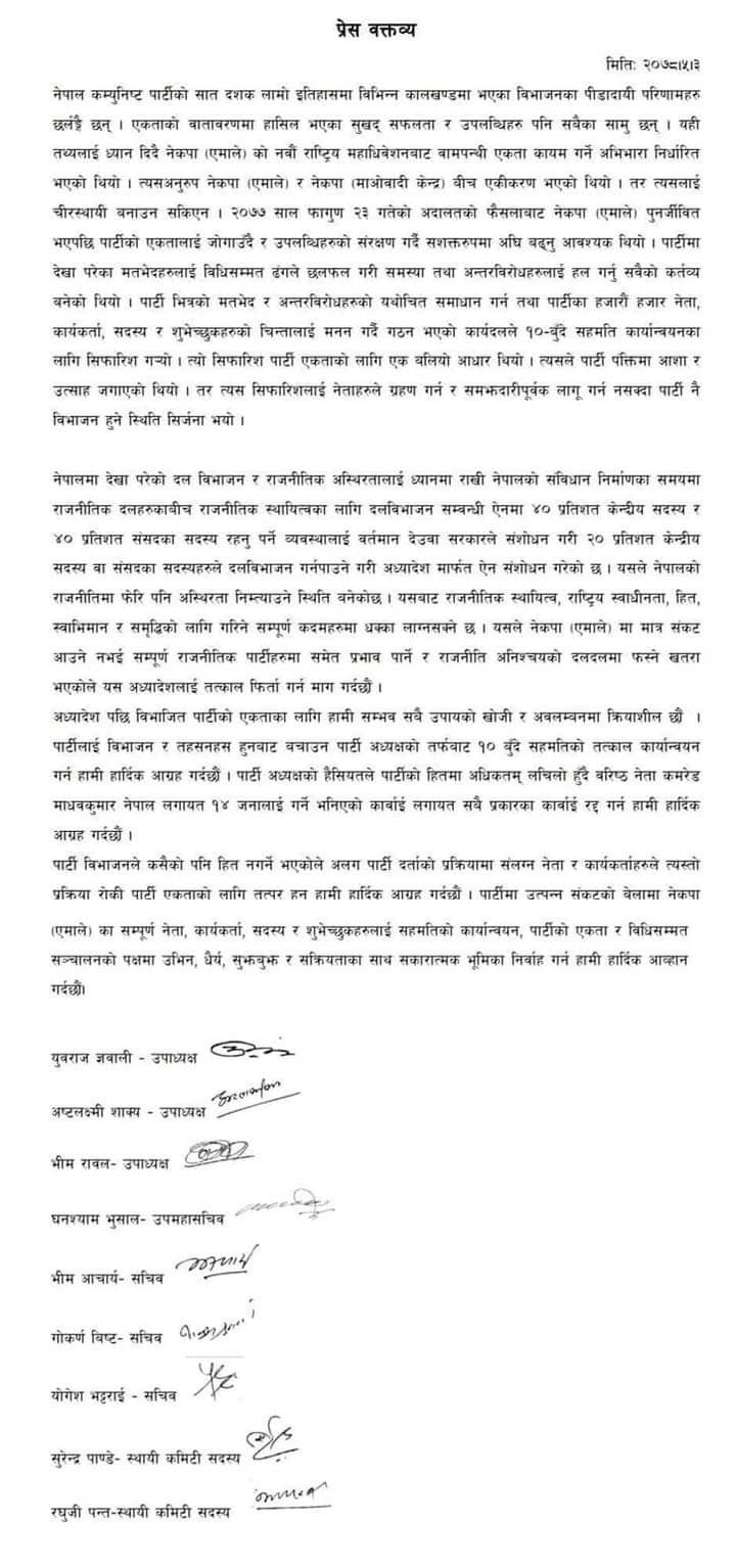 आयो एमालेका नौ नेताको संयुक्त बिज्ञप्ति,पार्टी एकता र बिधिसम्मत सन्चालनको पक्षमा उभिन आग्रह