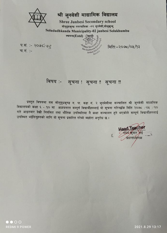 सोलुखुम्बु ।सोलुदुधकुण्ड नगरपालिका वडा नं-२ को जुनबेंसीमा रहेको जुनबेंसी माध्यमिक विद्यालयले शिक्षक तथा विद्यार्थीहरुको भौतिक रुपमै कक्षा सन्चालनमा ल्याउने भएको छ।