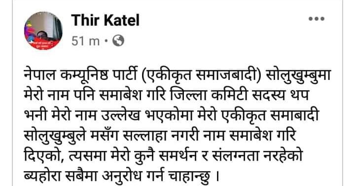 सोलुखुम्बु । नेकपा एमालेका नेता थिरप्रसाद कटेलले नवगठित नेकपा (एकीकृत समाजबादी) मा आफ्नो संग्लनता र समर्थन दुबै नरहेको बताएका छन् ।