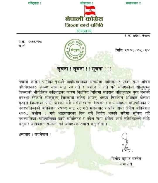 नेपाली कांग्रेस जिल्ला कार्य समिति सोलुखुम्बुका सभापति बिनोद कुमार बस्नेतका अनुसार परिबर्तित मिति अनुसार गाउँ तथा नगर अधिबेशन भाद्र २९ र प्रदेशसभा क्षेत्रीय अधिबेशन असोज ३ गते हुनेछ। यसअघि गाउँ तथा नगर अधिबेशन भदौ २७ र प्रदेशसभा क्षेत्रीय अधिबेशनका लागि असोज १ गतेको मिति तय गरिएको थियो।