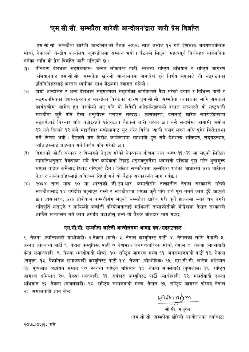 सीपी गजुरेलद्वारा जारी विज्ञप्तिमा भनिएको छ, ‘०६४ साल माघ १० मा भारतको जीएमआर कम्पनीसँग तत्कालीन नेपाल सरकारले गरेको सम्झौतालाई १४ वर्षदेखि झुलाएर राख्ने र सम्झौतामा भएका कुनै पनि शर्त पूरा नगर्ने काम हुँदै आएको छ। त्यसकारण, उक्त धोकेवाज कम्पनीसँग भएको सम्झौता खारेज गरी कुनै हालतमा म्याद थप नगरी क्षतिपूर्ति भराउने र माथिल्लो कर्णाली परियोजनालाई माथिल्लो तामाकोसीको मोडेलमा नेपाल सरकारले आफैँले सञ्चालन गर्ने काम अगाडि बढाओस् भन्ने यो बैठक जोडदार माग गर्दछ।’