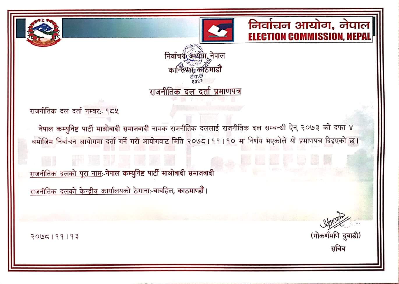 स्थानीय तह निर्बाचनका लागि शनिबार पार्टी दर्ता गर्दै पार्टीको नाम नेकपा माओवादी समाजबादी राखिएको पार्टी सचिब अरुण घिसिङले जानकारी दिए।घिसिङका अनुसार परिवर्तित नेकपा माओवादी समाजबादीको बिधानमा अध्यक्ष कर्णजीत बुढाथोकी, वरिष्ठ नेता तिलक थापा मगर, उपाध्यक्षद्वयमा रंगनाथ ढकाल र बिनोद उपाध्याय महासचिवमा नरेश शाही सचिबत्रयमा अरुण घिसिङ मेघ बहादुर खत्री र सिंह बहादुर वि.क.सहित ८ जना पदाधिकारीको ब्यबस्था गरिएको छ।