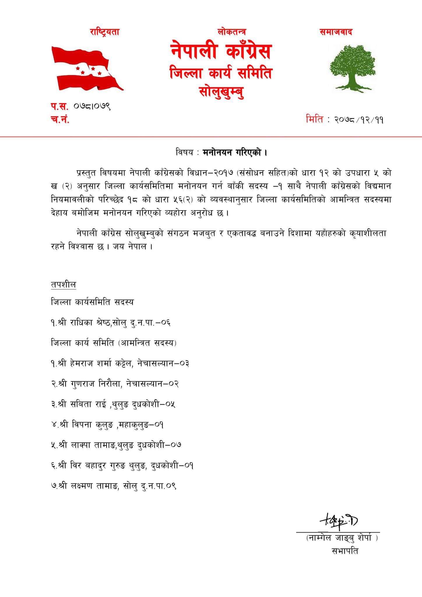 नेपाली कांग्रेसको बिधान -२०१७(संशोधन सहित)को धारा १२ को उपधारा ५ को ख (२) अनुसार सोलुदुधकुण्ड नगरपालिकाकी राधा श्रेष्ठलाई जिल्ला कार्यसमिति सदस्य मनोनयन गर्नुभएको हो।यसैगरी नेपाली कांग्रेस को विद्यमान नियमावलीको परिच्छेद १८ को धारा (५६) २ को ब्यबस्था अनुसार आमन्त्रित सदस्य मनोनीत गर्नुभएको हो।