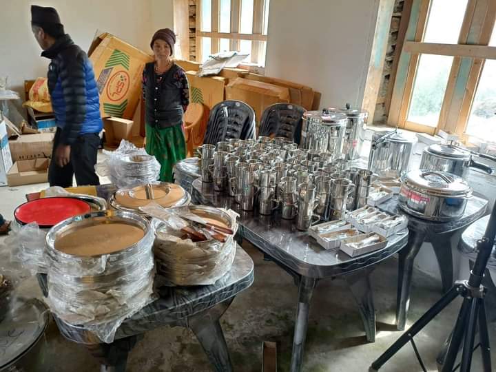 सुप बोउल १५० थान,चम्चा १५० थान,टि पट २ थान,थाल १५० थान,डेक्ची १ थान,मिक्सर सहितको,साउण्ड सिस्टम १ सेट,कुर्सी ३२ थान र टेबल ८ थान हस्तान्तरण गर्नुभएको थियो।